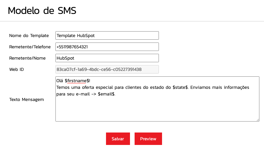要注册短信模板,请转到 SMS > SMS Templates 菜单。在 HubSpot 调用中使用 Web ID 字段。